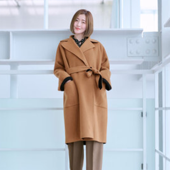 フロントはボタンレスで、付属のベルトをきゅっと締めれば洗練されたムードに。ベルトを外して開けて羽織ると、テーラードカラーが際立ち、ジャケットライクなハンサムな印象に。着こなしの幅が広がるデザインが魅力です。